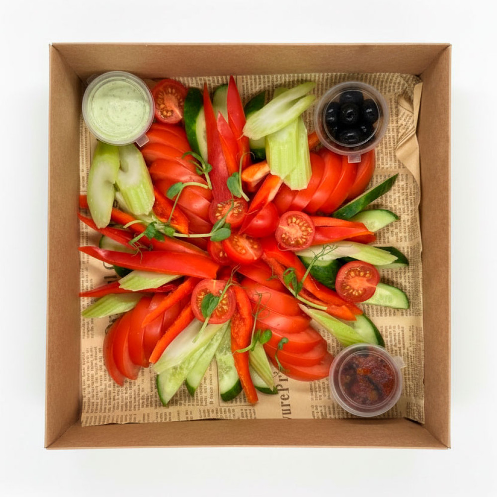 «Сет Овощной» — универсальная овощная нарезка для любой компании. Свежие томаты и черри, сладкий перец, хрустящий огурец, маслины и оливки дополняет ароматная зелень. Подходит для фуршетов, кофе‑брейков, пикников и как лёгкое дополнение к горячим блюдам. Вегетарианский и постный вариант, удобная подача, гармонирует с соусами и дипами (по запросу).