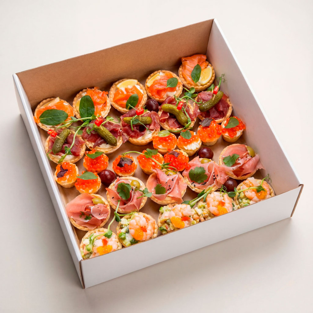 Бокс с тарталетками AVOBOX — удобный и эффектный формат для фуршетов, корпоративов и домашних праздников. На хрустящей основе собраны популярные сочетания: классика с сыром и икрой, нежное оливье с креветкой, сытная ветчина с черри, говядина с огурцом и деликатные тарталетки с крем‑чизом и икрой. Порционная подача экономит время на подготовку и делает сервировку по‑ресторанному — остаётся только открыть коробку и поставить на стол.