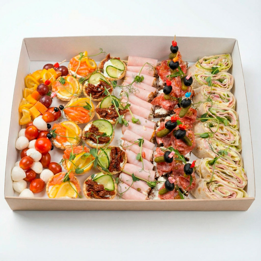 МИКС‑бокс — универсальное фуршетное ассорти, которое закрывает разные вкусы гостей. В набор входят нежные тарталетки с лососем и с вяленым томатом, порционные рулетики с ветчиной, канапе капрезе, сырные канапе и канапе с салями. Удобная порционная подача экономит время на подготовку: откройте коробку — и сервировка по‑ресторанному готова. Идеально для корпоративов, дней рождения, домашних праздников и welcome‑зон.