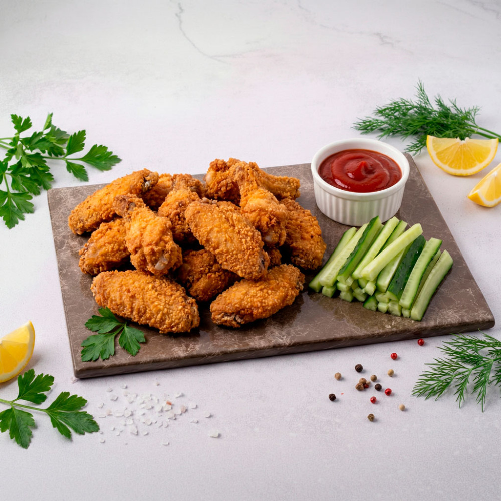 Крылья с хрустящей корочкой и сочным, нежным мясом готовим в фирменных специях, чтобы вкус получился ярким и узнаваемым. Подаём с овощной нарезкой — она добавляет свежести и приятного контраста.
