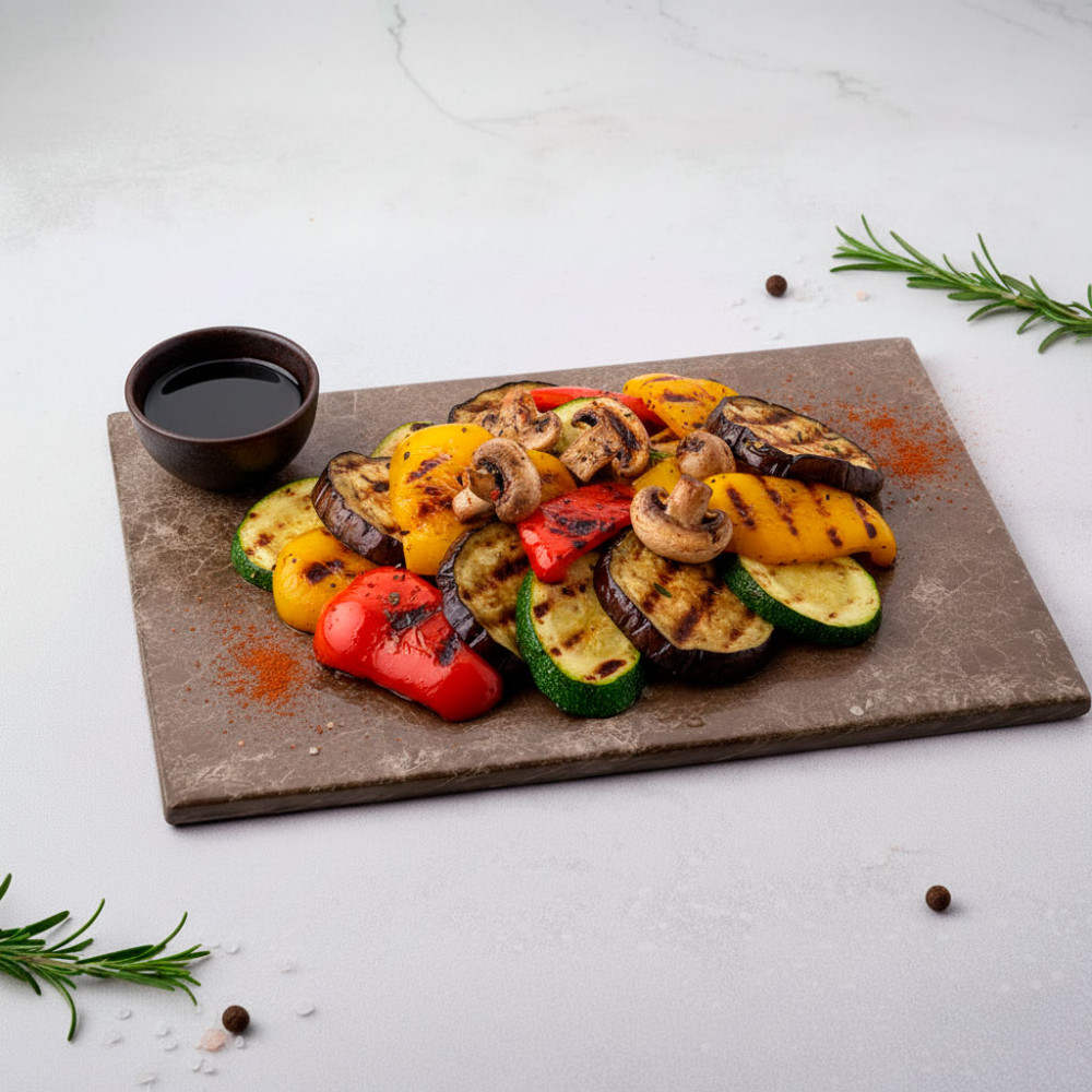 Сет «Овощи гриль» — сочная подборка сезонных овощей с характерной румяной корочкой и тонким ароматом дымка. Сладость болгарского перца, мясистый баклажан и цукини, пружинистые шампиньоны подчёркнуты паприкой и умами‑нотой соевого соуса. Отличный выбор как самостоятельное блюдо, так и гарнир к мясу/рыбе или к горячим сетам. Подаём готовым к сервировке.