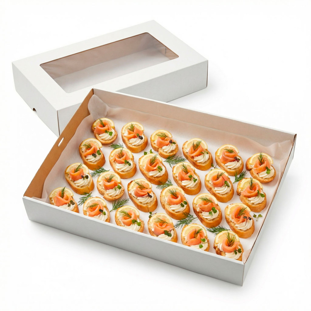 Состав: багет, крем-чиз, лосось слабосолёный, лимон, укроп, микрогрин. Количество: 28 шт. Упаковка: белая крафтовая коробка с прозрачным окошком.