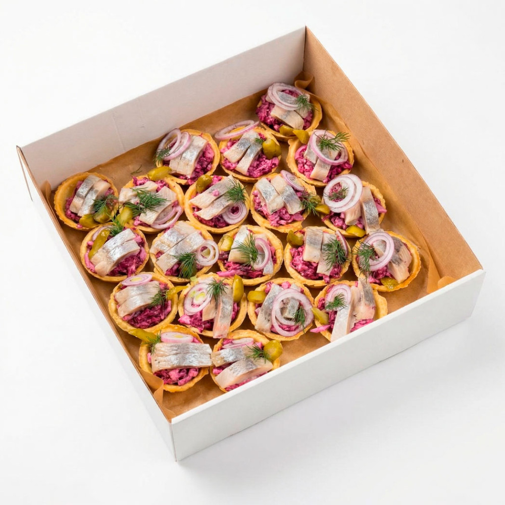 Классическая закуска в современном исполнении: хрустящая тарталетка, сочная свекла и маринованные огурцы, сверху — нежная сельдь и щепоть микрозелени для свежести. Формат 24 шт. (700 г) экономит время на подготовку и смотрится аккуратно на любом фуршетном столе — от домашнего праздника до офисного кофе‑брейка.