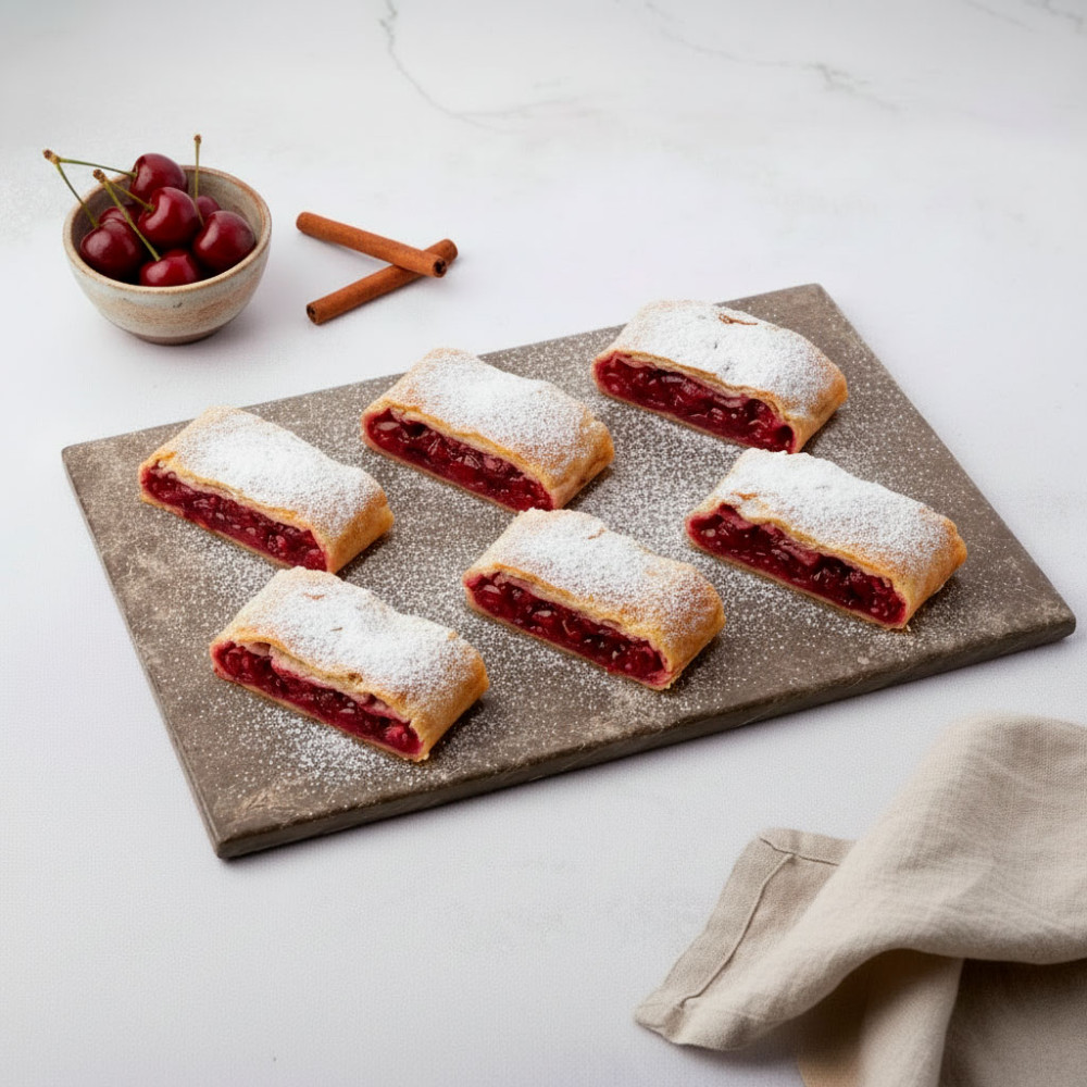 Ароматный вишнёвый штрудель с хрустящим слоёным тестом и щедрой ягодной начинкой. Сбалансированная сладость и натуральная кислинка вишни делают десерт лёгким и ярким. Формат 200 г удобен для кофе‑брейков, домашнего чаепития и десерта «с собой».