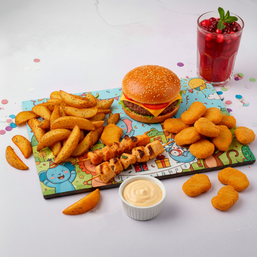 Детский бокс AVOBOX собран так, чтобы каждому ребёнку было вкусно и удобно. В набор входят хрустящие запечённые картофельные дольки, сочный бургер, золотистые наггетсы, нежный куриный шашлык и соус для макания. Клюквенный морс — яркий ягодный напиток, который отлично освежает. Подходит для дня рождения, школьного мероприятия, пикника или семейного ужина.