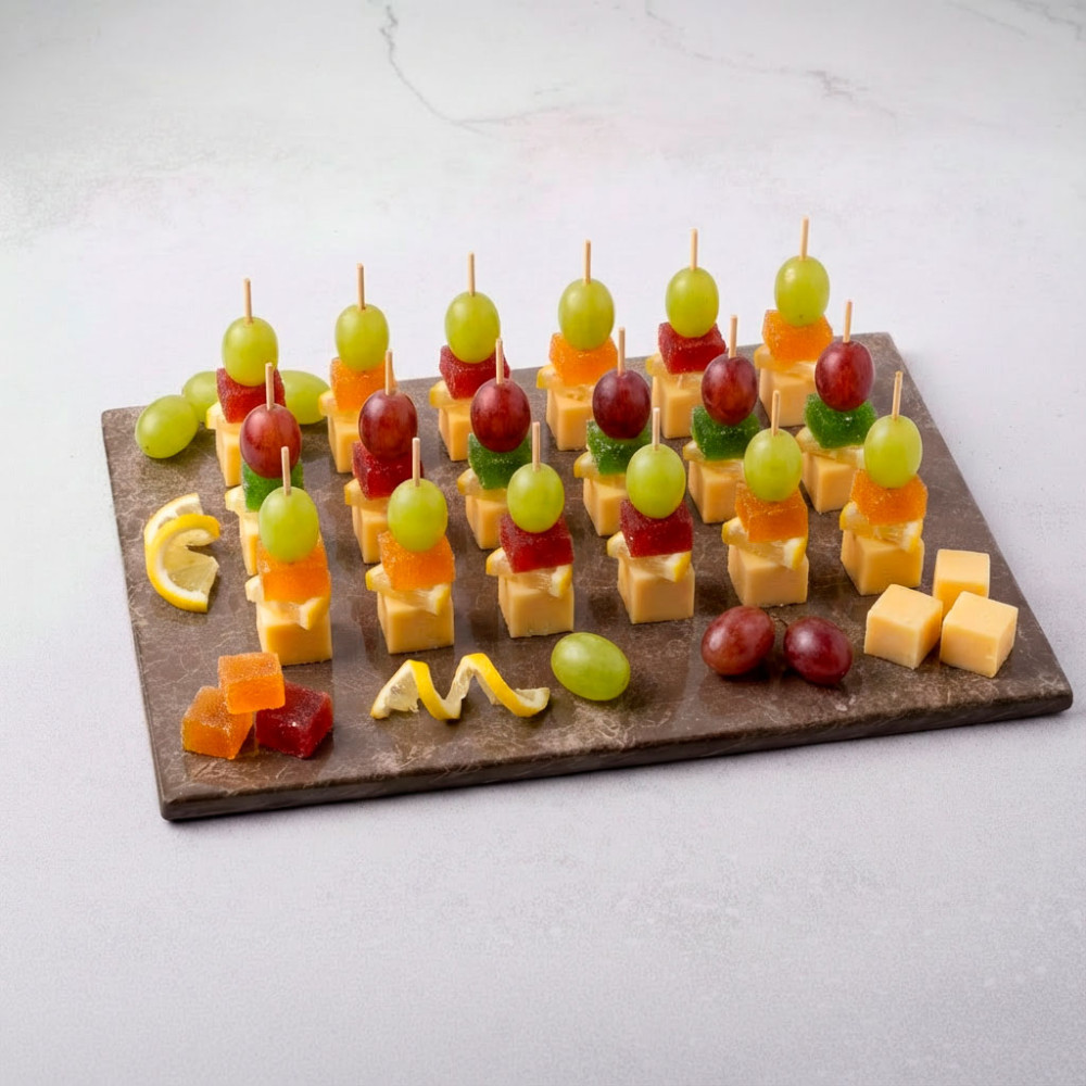 Бокс канапе с виноградом, сыром чеддер, фруктовым мармеладом и свежей нотой лимона. Яркий сладко‑солёный вкус, который нравится и детям, и взрослым. Готовое решение для фуршета, кофе‑брейка и домашних праздников.