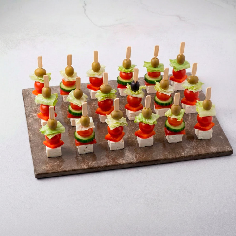 Канапе «Греческий» — легкая овощная закуска с хрустящим айсбергом, сочными огурцом и томатами черри, сладким болгарским перцем, оливками и нежным сыром фета. Отлично подходит для фуршета, кейтеринга и праздничного стола.
