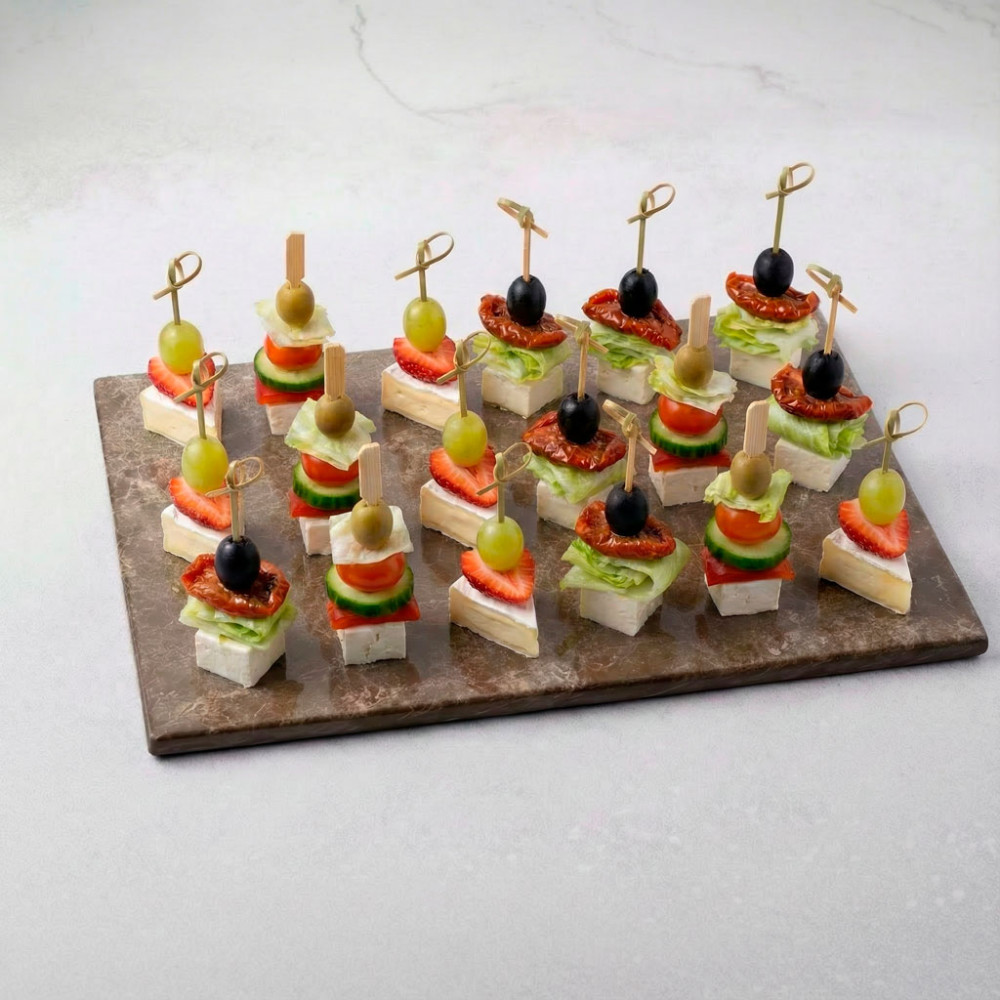 «Канапе Микс 3» — сет канапе ассорти из 3 вкусов: канапе с сыром «Фета», вяленым томатом, салатом айсберг и маслинами; канапе «Греческий» с болгарским перцем, огурцом, томатами черри, айсбергом, оливками и сыром фета; канапе с камамбером, клубникой и виноградом. Подходит для фуршета, кейтеринга и праздничного стола.