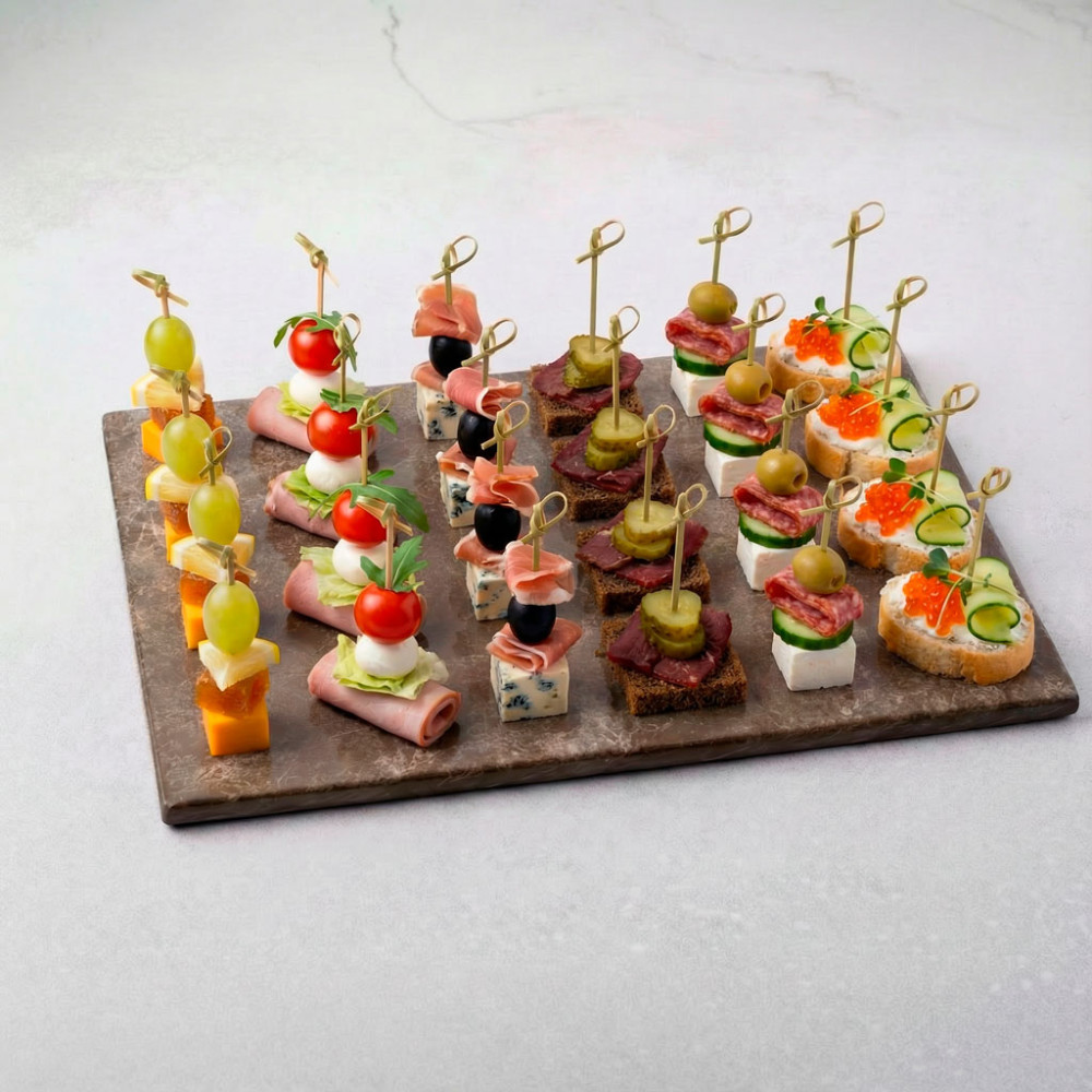 «Канапе Макс» — большой сет из 6 видов канапе: сырно‑фруктовые с виноградом, чеддером, мармеладом и лимоном; с ветчиной, моцареллой мини, айсбергом, томатами черри и руколой; с сыром дор-блю, маслинами и прошутто; на черном тостовом хлебе с сыровяленой говядиной и консервированными огурцами; с фетой, огурцом, сырокопченой колбасой и оливками; на багете с творожным сыром, икрой, огурцом и микрозеленью. Подходит для фуршета, кейтеринга и праздничного стола.