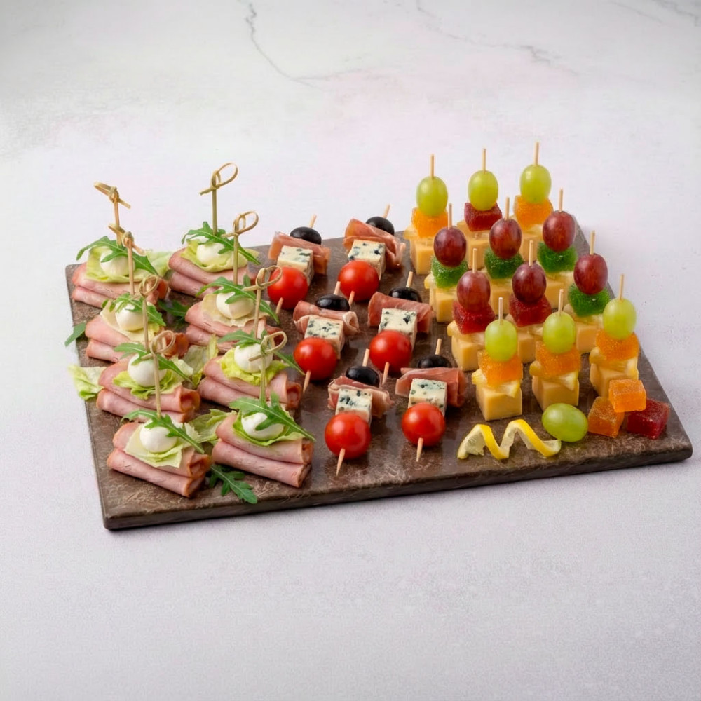 Канапе Микс 1 от AVOBOX — три популярных вкуса в одном наборе: Дор‑блю с прошутто и томатами, ветчина с мини‑моцареллой и руколой, а также сладко‑солёные канапе с виноградом, чеддером, мармеладом и лимоном. Удобная подача для фуршета и кофе‑брейка. Доставка по Минску и пригороду.