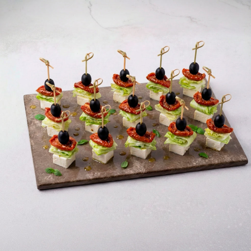 Канапе с сыром «Фета», вяленым томатом, хрустящим салатом айсберг и маслинами. Легкая, пикантная закуска с ярким средиземноморским вкусом — подходит для фуршета, кейтеринга и праздничного стола.