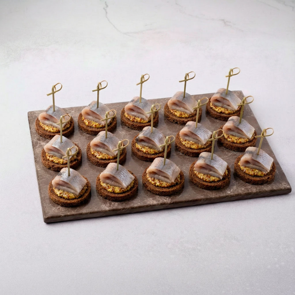 Канапе на черном тостовом хлебе с сельдью и французской горчицей — яркая закуска с насыщенным вкусом и пикантной зернистой ноткой. Отлично подходит для фуршета, кейтеринга и праздничного стола.