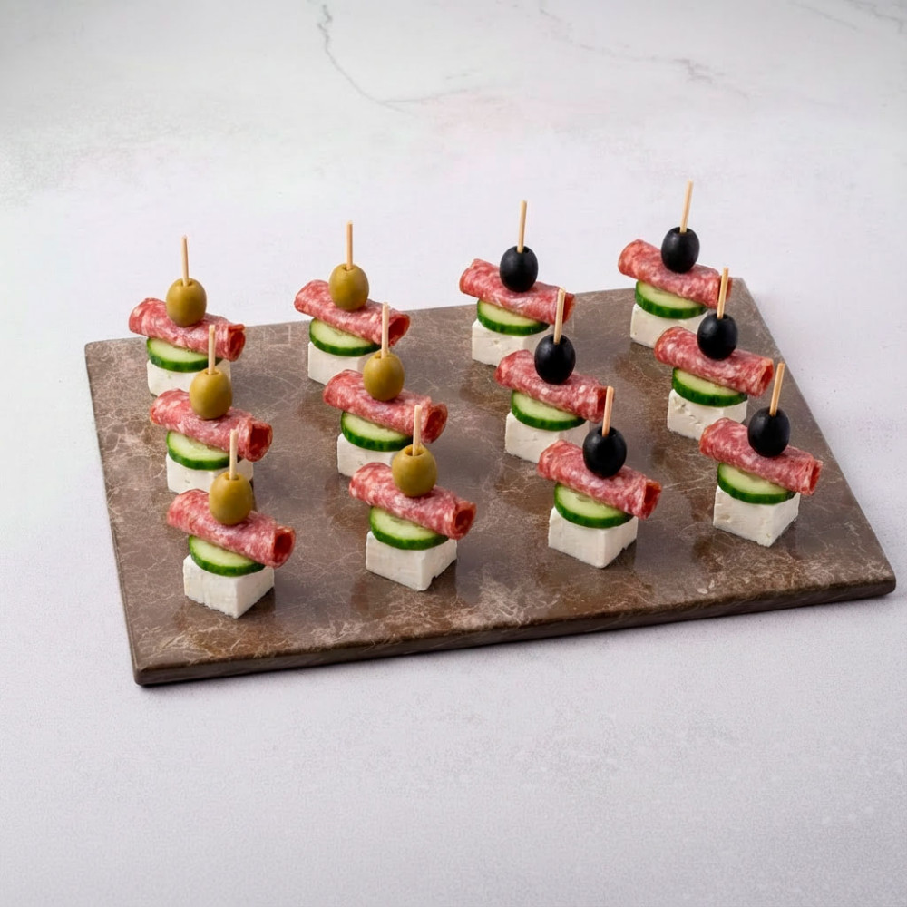 Канапе с сыром «Фета», свежим огурцом, сырокопченой колбасой и оливками — пикантная мини‑закуска с балансом сливочного, солоноватого и свежего вкуса. Подходит для фуршета, кейтеринга и праздничного стола.
