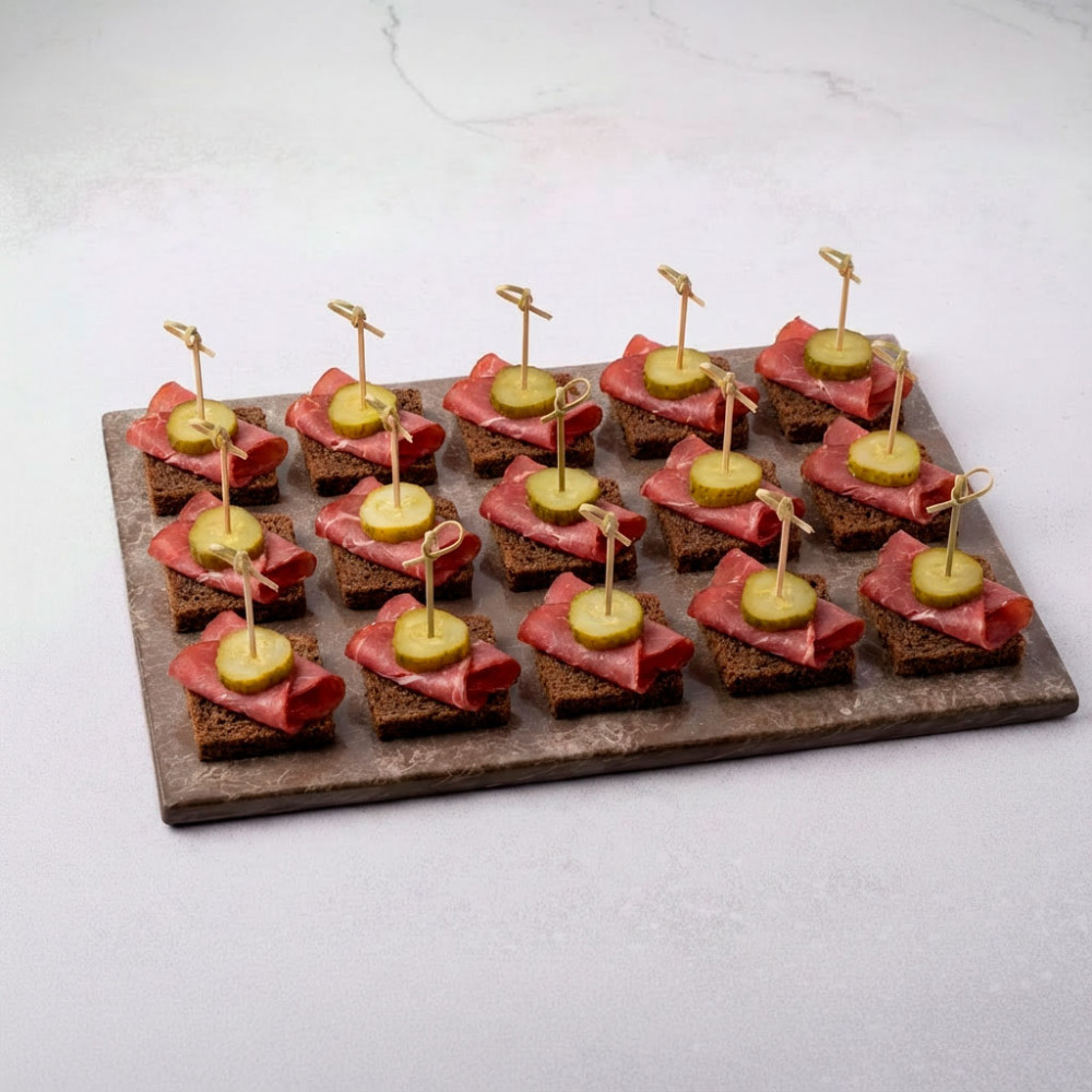 Канапе на черном тостовом хлебе с нежной сыровяленой говядиной и пикантным консервированным огурцом. Яркая мини‑закуска для фуршета, кейтеринга и праздничного стола.