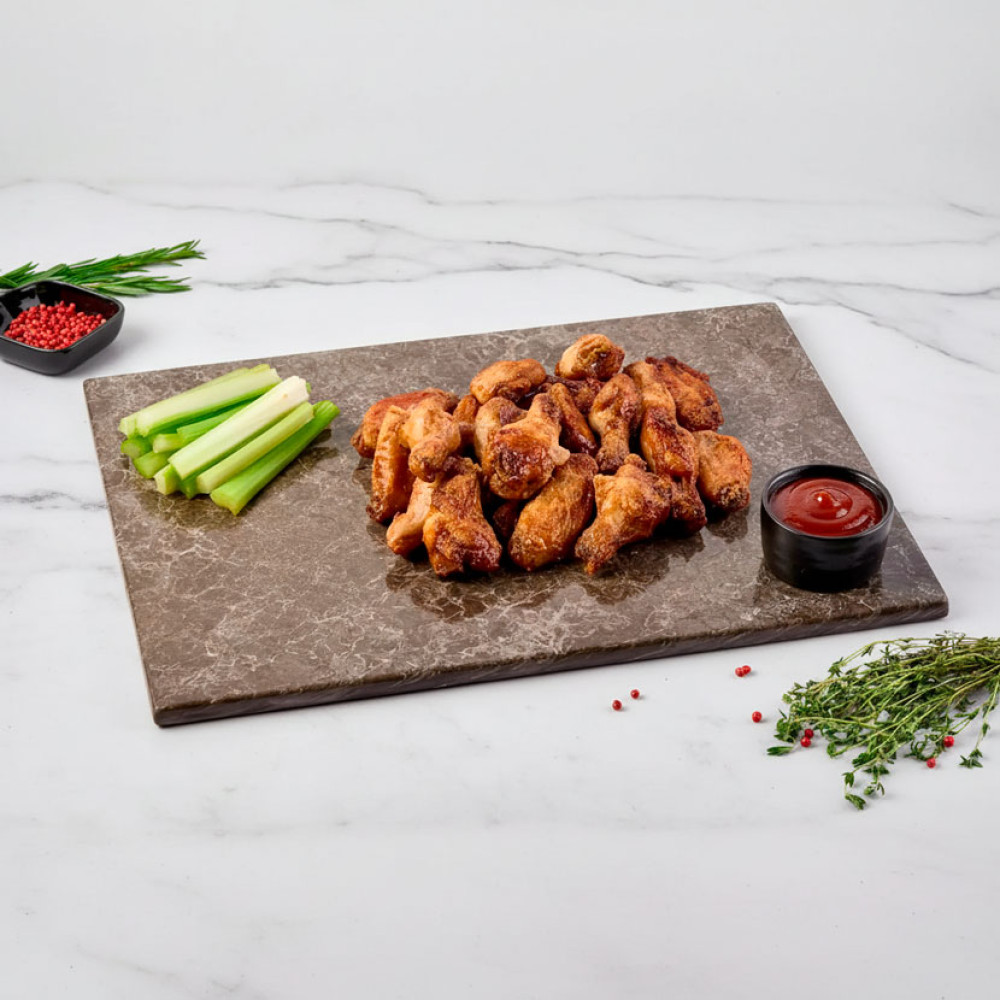 Крылья с хрустящей корочкой и сочным, нежным мясом готовят с ароматными специями. Подаём с овощной нарезкой — это добавляет контраста и делает закуску ещё ярче.