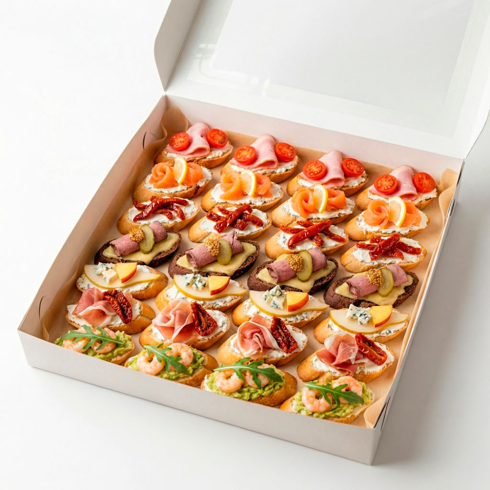 Откройте крышку — и перед вами целая палитра вкусов. 28 мини-тапасов ручной сборки, где каждый кусочек хрустящего багета — маленькое гастрономическое путешествие.