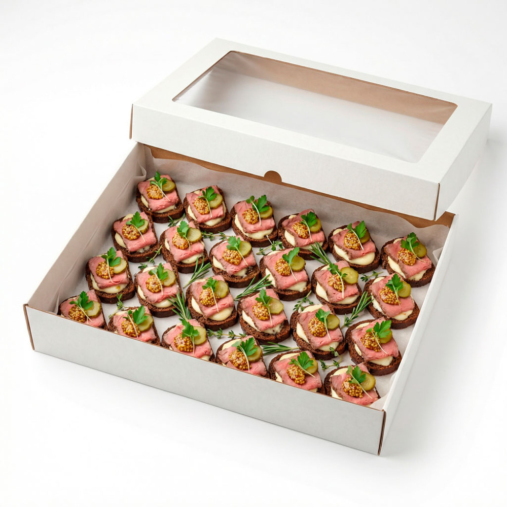 Состав: хлеб чёрный, сыр плавленый, говядина, огурец консервированный, горчица французская, петрушка, микрогрин. Количество: 28 шт. Упаковка: белая крафтовая коробка с прозрачным окошком.