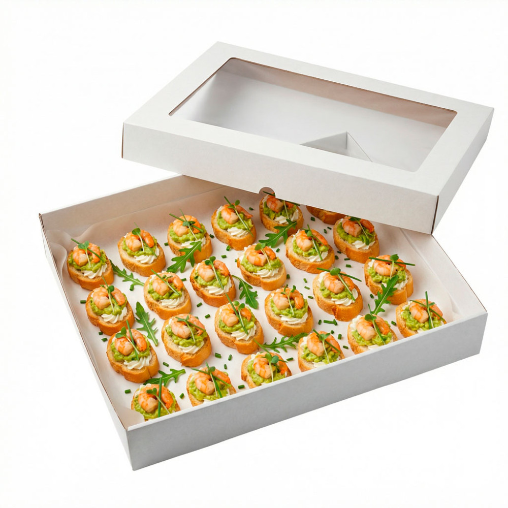 Состав: багет, крем-чиз, авокадо, креветка, руккола, шнитт-лук, микрогрин. Количество: 28 шт. Упаковка: белая крафтовая коробка с прозрачным окошком.